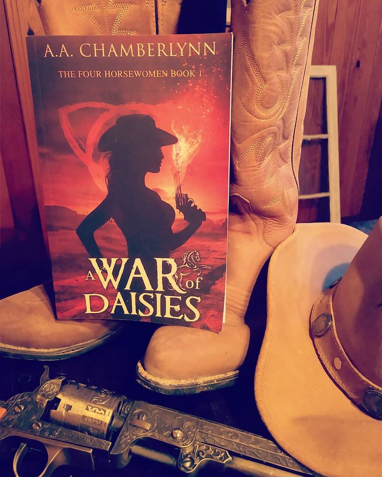 Happy book birthday to A War of Daisies, which launches my Four Horsewomen of the Apocalypse series!! It's my 13th published book, but a first in many ways. My first fantasy western, my first book set in the 1800s, my first book with four main characters (that was a fun challenge), the first book I've released in hard copy, and the first for which I've made a live-action book trailer. It's Westworld meets Good Omens with a feminist twist. Cowgirls and angels and demons. Horses and six-shooters and cross-country races. A super fun time.